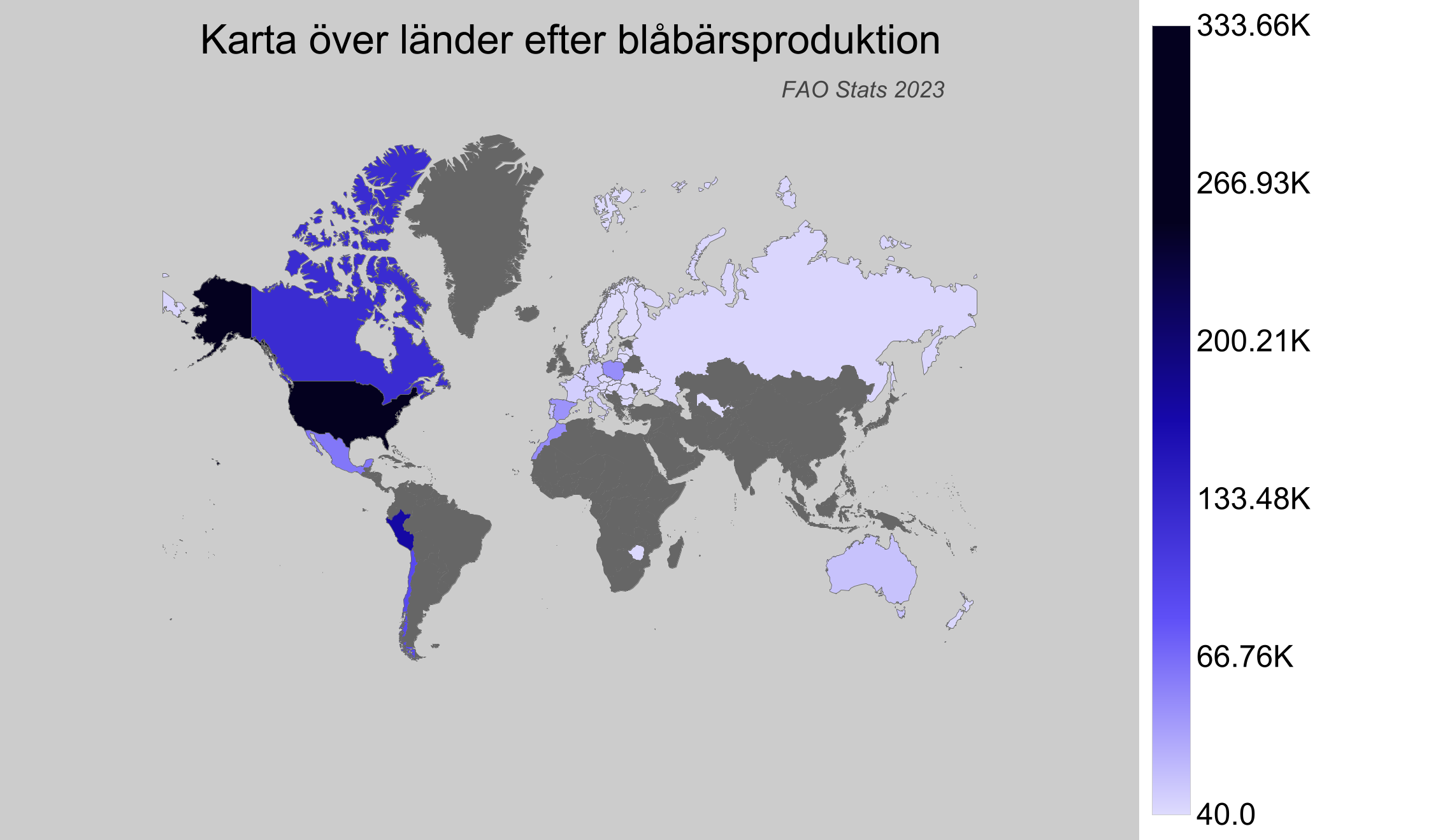 Blåbär är en näringsrik frukt, känd för sina antioxidanta egenskaper och hälsofördelar. De växer bäst i tempererade klimat med väl dränerad jord, vilket gör dem idealiska för regioner med svala somrar och milda vintrar. Denna rapport från Livsmedels- och jordbruksorganisationen (FAO) presenterar den senaste statistiken för 2023, vilket ger insikt i globala produktionstrender.